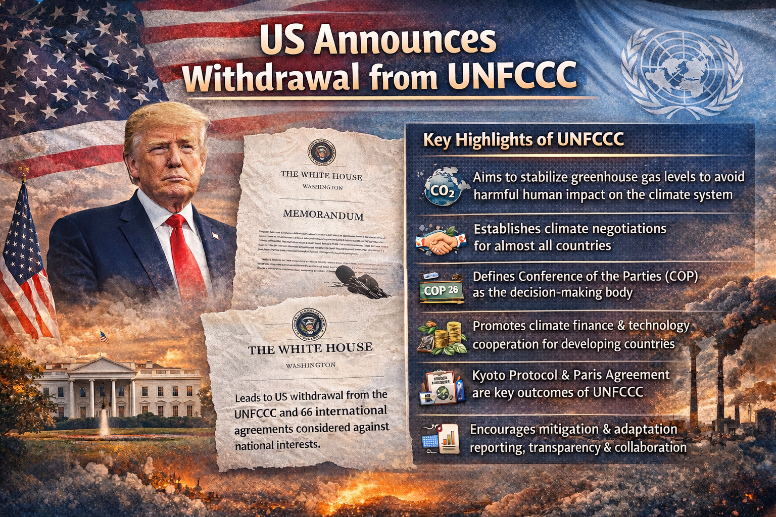President Donald Trump announced that the United States would officially withdraw from the United Nations Framework Convention on Climate Change (UNFCCC), a foundational global climate treaty upon which key agreements on greenhouse gas reduction and international climate action are based. This ruling was proclaimed in a White House memorandum, which instructed the withdrawal from 66 international organisations and treaties considered against U.S. interests, among them the major climate bodies, the UNFCCC and the Intergovernmental Panel on Climate Change. The step, as part of a broader withdrawal from multilateralism, has increased America's pullback from global climate collaboration and has become an international issue of widespread anxiety.