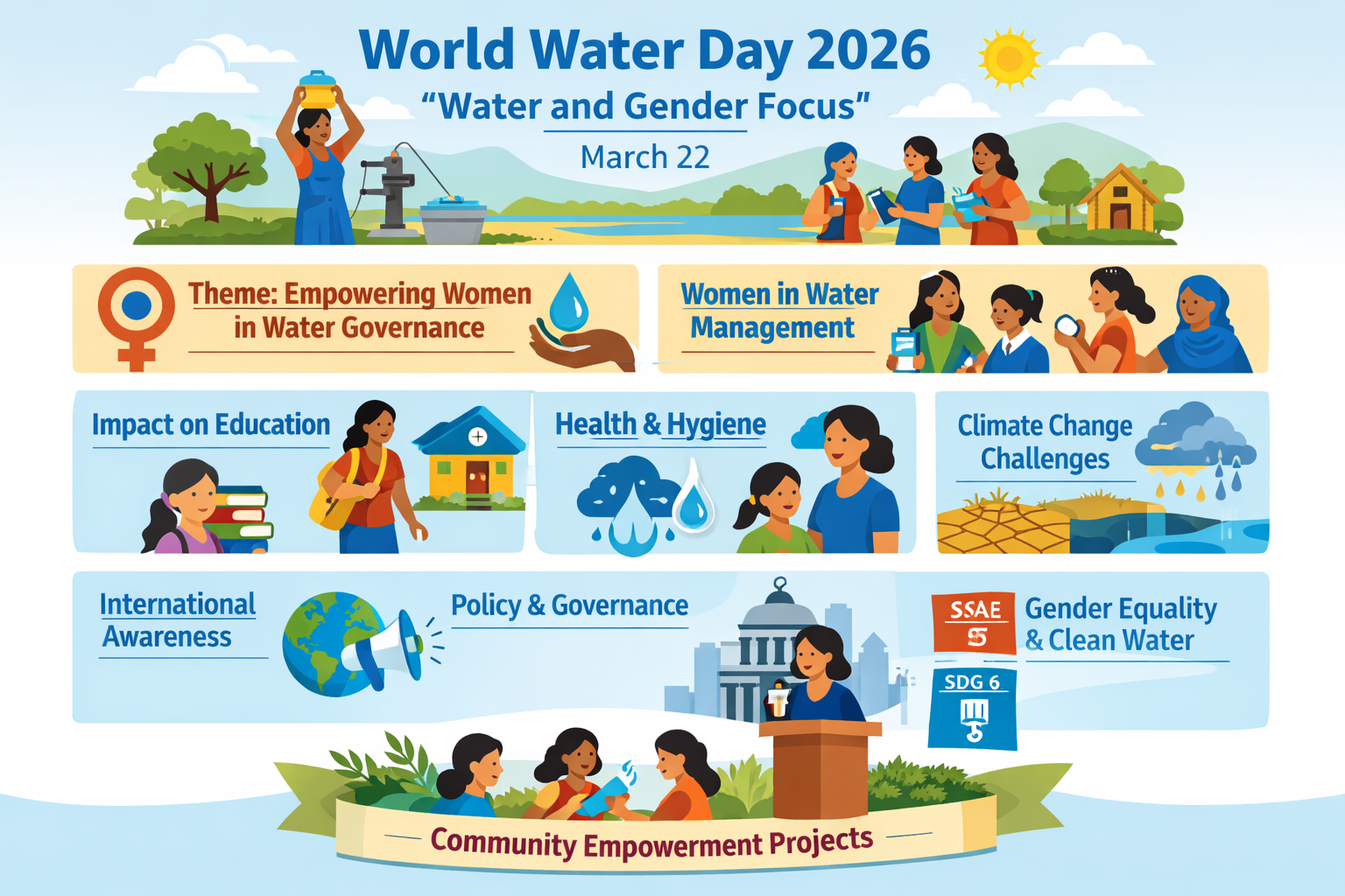 The 2026 World Water Day is a reminder that access to water is closely linked to gender equality, with water scarcity affecting women and girls more than men globally. It is a global event celebrated every year on March 22 and raises awareness of sustainable water management and the necessity of including policies. Women have a major role in most areas in terms of collecting water, which affects their education, health, and economic opportunities. The theme for 2026 will be the empowerment of women as major stakeholders in water governance; equitable access and challenges such as sanitation, hygiene, and climate change will be dealt with to realise a sustainable and inclusive future.
